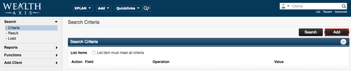 - Click Add in the Advanced Search screen. A variety of different searching criteria displays.