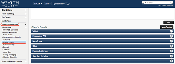 Tip: Click View Partner on this page to enter the partners Estate Planning details.