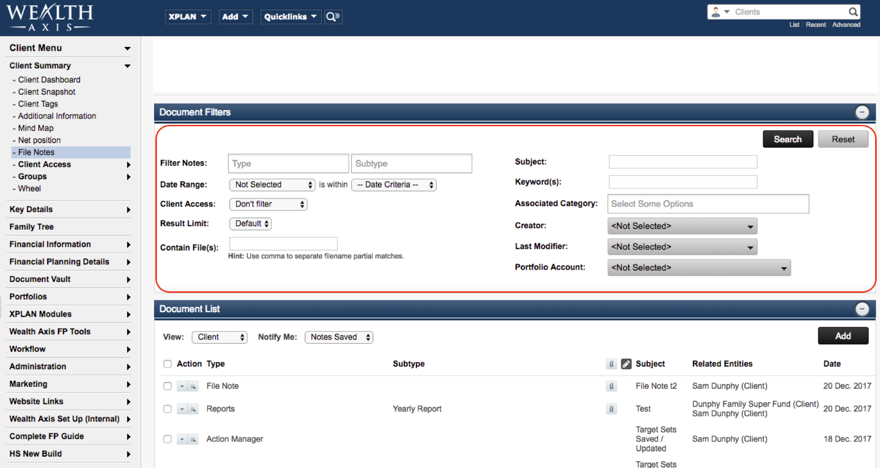 The Document Library allows for general and client-specific Notes to be stored within XPLAN. Key features of the Document Library include:
