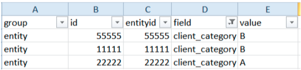 Apply Filters to the file to make it easier for you to update it with the required mapping value. Use the field column to identify which fields you would like to request mappings for. For example, if you would like to request client category mappings then only tick client_catergory when filtering the field column.