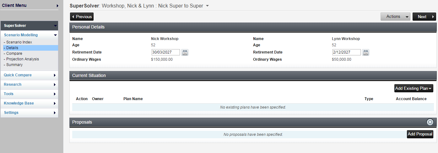 Select the Proposal type Client>Rollover/Consolidate Plans. This will present the current Superannuation Plan and allow the selection of how this fund should be treated. Also select the Partner Proposal type.