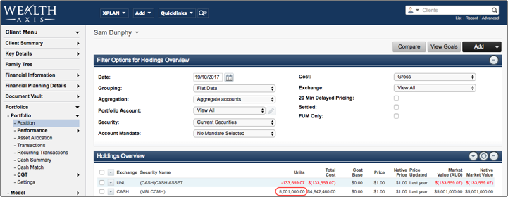 The Filter Options for Holding Overview panel will now display a field called Portfolio Account. (This field will only appear if an account has been created for the client's portfolio.) Ensure you select the correct account the investment is to be held under prior to adding the investment by clicking on the drop down box. A list of accounts for the client will be listed to select from.