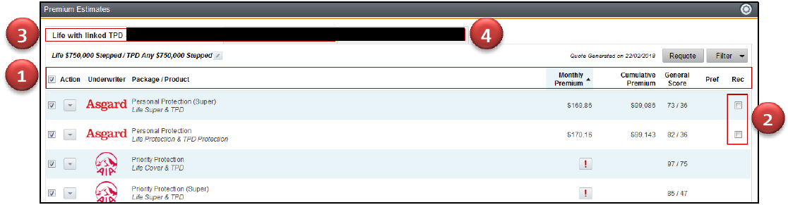 Note: It is highly unlikely Risk Researcher will allow you to package similar policies, such as Life with TPD and a second Life with TPD policy. If you are considering packaging, you will need to source a packaged quote from the provider. We recommend that you leave the product selection per cover needed so that the purpose can flow directly into the advice document.e. To select the insurance package you want to recommend, click the Rec tick box.
