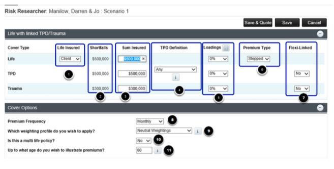 The top panel will list the types of cover selected. In this example Life with linked TPD and Trauma.