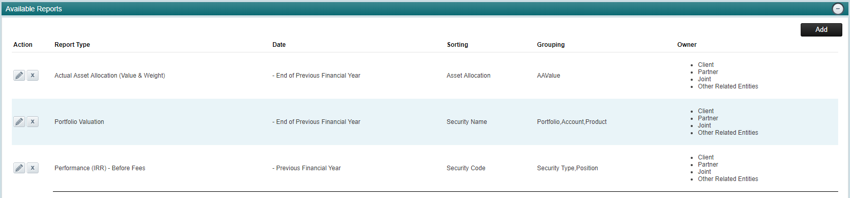 - Produce consolidated reports for your client’s portfolios, providing a combined view of the accounts and assets held by the client, their spouse and related entities.
