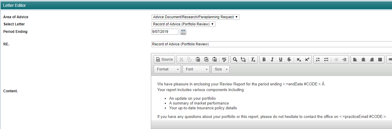 - Select Letter: Letters only relevant to the Advice Document/Research/Paraplanning Request group are available to choose. Select Record of Advice (Portfolio Review).