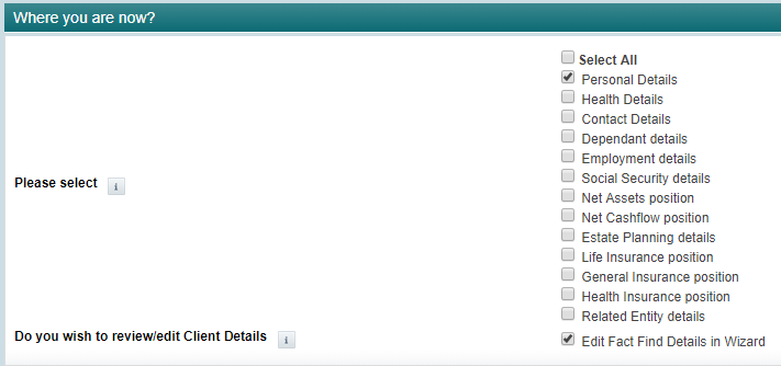 This section has now been included in the wizard due to selecting this option in the previous page of the wizard (Where you are now). As previously suggested you are now able to review and update this section of the clients Fact Find as required.