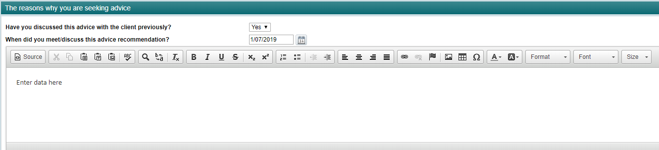 - Have you discussed this advice with the client previously: Select the appropriate Yes or No response. If you select Yes a further field is made available;