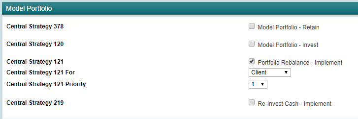 - Place a tick in the Central Strategy 121: Portfolio Re-balance - Implement.