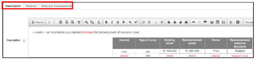 Review the prepopulated text in the Description, Reasons and Risks and Consequences tabs, and tailor to your client’s circumstances.