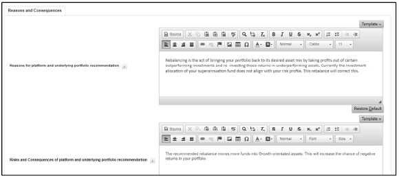 Review the prepopulated text in the Description, Reasons and Risks and Consequences tabs, and tailor to your client’s circumstances.