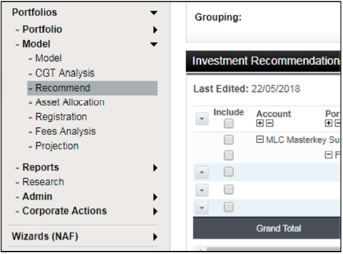 Create the transaction details of the proposed switch from the Recommend page, firstly by noting the amount to be sold down on the selected funds.