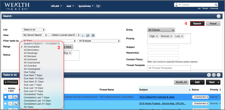 The task list report will display all your incomplete tasks with the description and comment of the task, as well as other information such as the due date for each task, the tasks type, subject status and the entity the task belongs to.