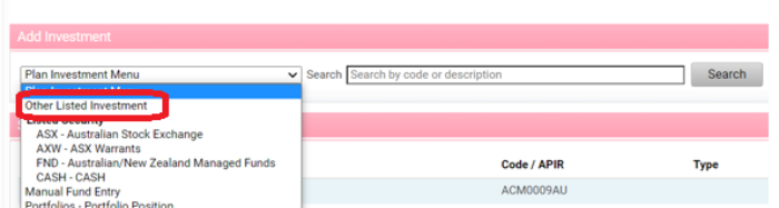 Sites that use FundData as the data source now have the ability to manually add Listed Investment Companies (LIC) options when modelling via the new drop down selection option Other Listed Investment. The code for the LIC can then be added to the search.