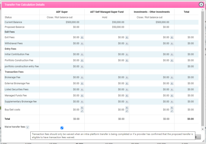 Clicking the Transfer fees details button in the Details screen of the scenario allows you to select Waive transfer fees. You should only waive the transfer fees where allowed by the product provider. A message detailing when to select it appears when you hover on the information box next to Waive transfer fees.