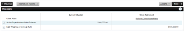 For example, if Client is selected and Retirement is the selected option to model a Rollover/Consolidate proposal then the Details screen will appear as: