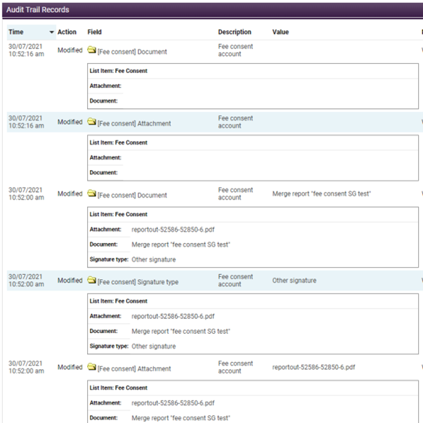 When a fee consent form is merged from within the opt-in & fee consent element or when merged from outside the element, for example, merge report or via a wizard: