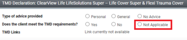 "How is TMD requirement not met?" do not currently have any default text. We do want to include it as an option. So it will need changes in the TMD declaration form screen.