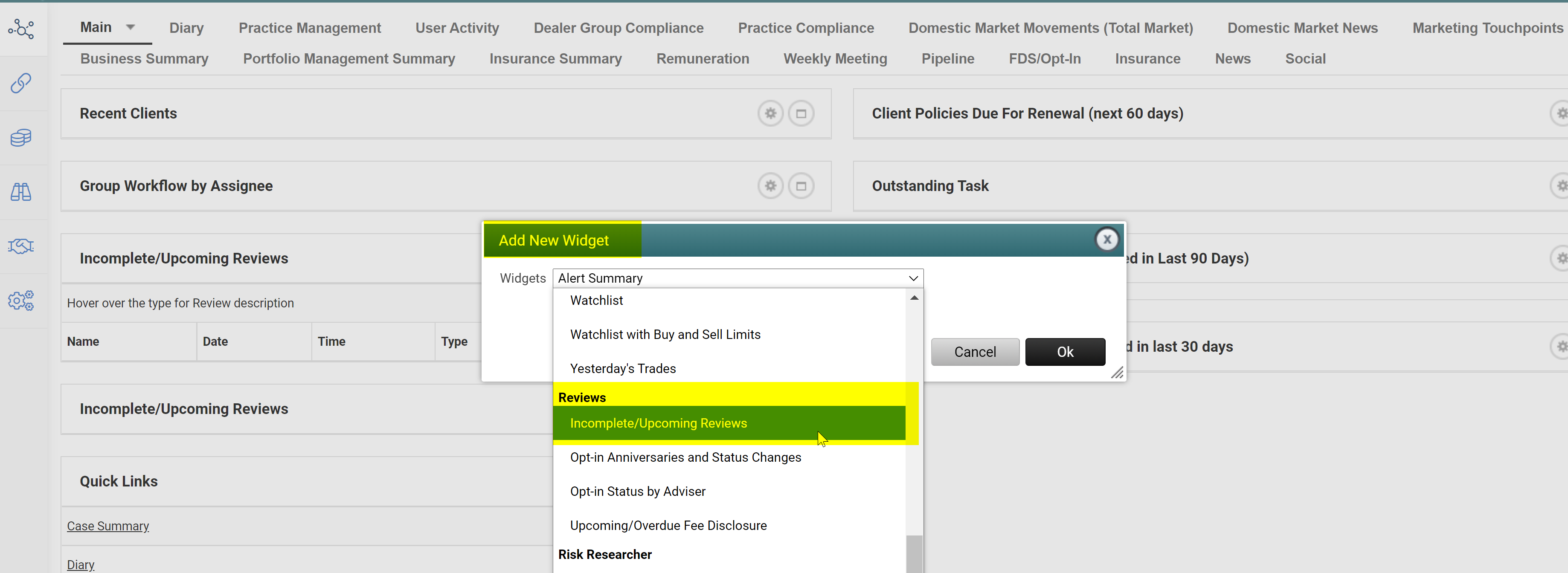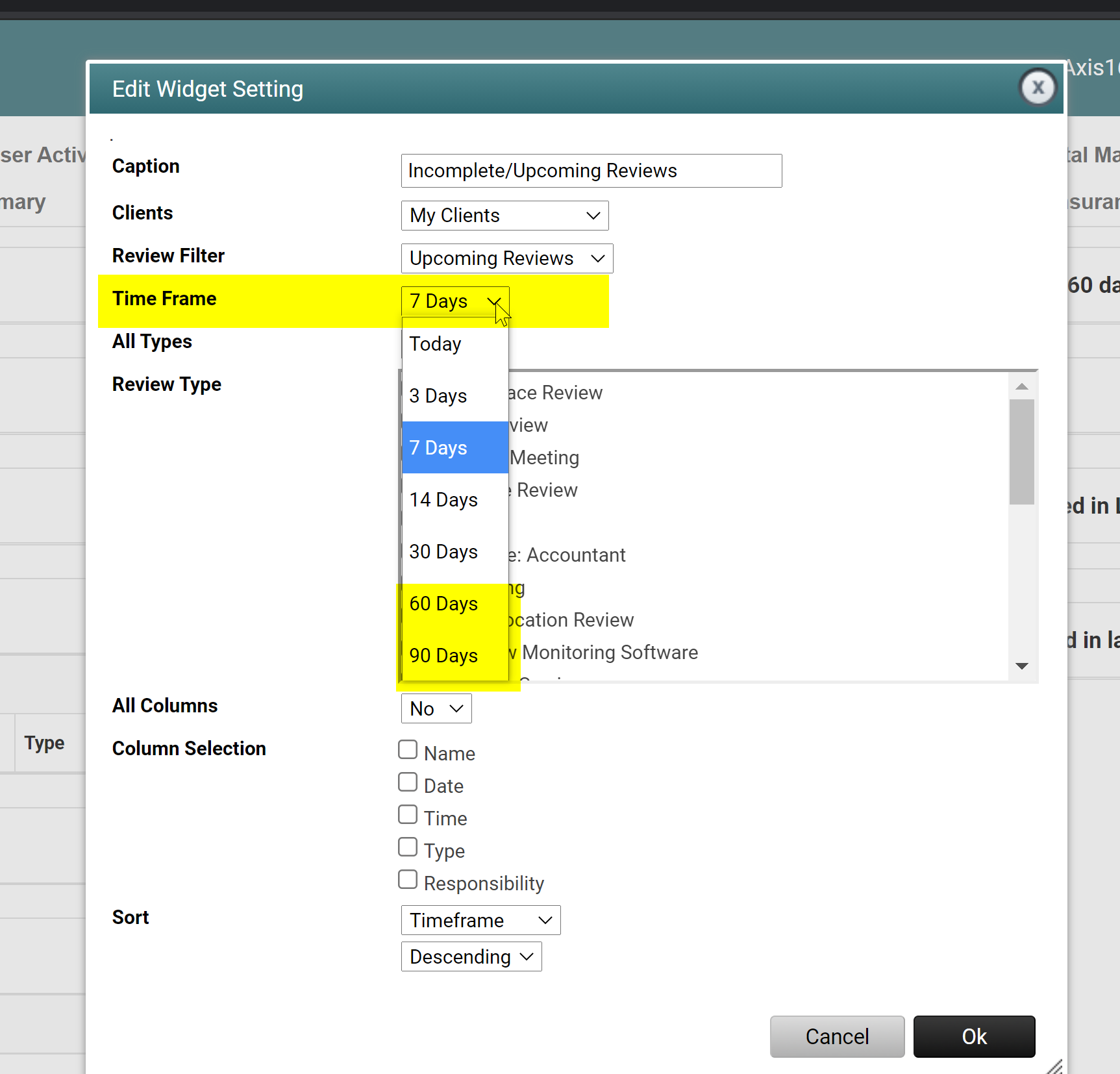 The incomplete/upcoming reviews widget has been enhanced to allow the selection of 60 or 90 day periods for upcoming reviews to be displayed on your dashboard. See below widget settings: