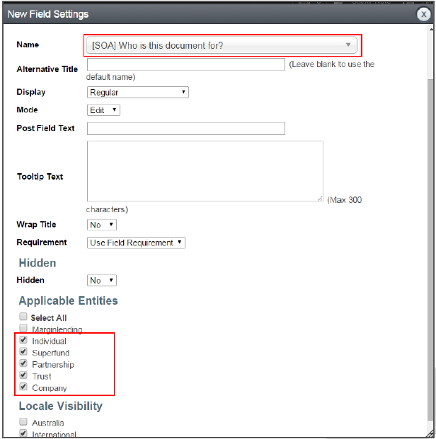 When adding the field ‘First Name’, only select ‘Individual’ for the ‘Applicable Entities’ as fields are available for the other entities (i.e. [Key Details – Company] Company Name and then select ‘Company’ as the ‘Applicable Entities’)