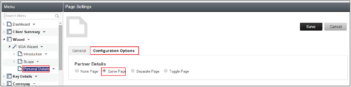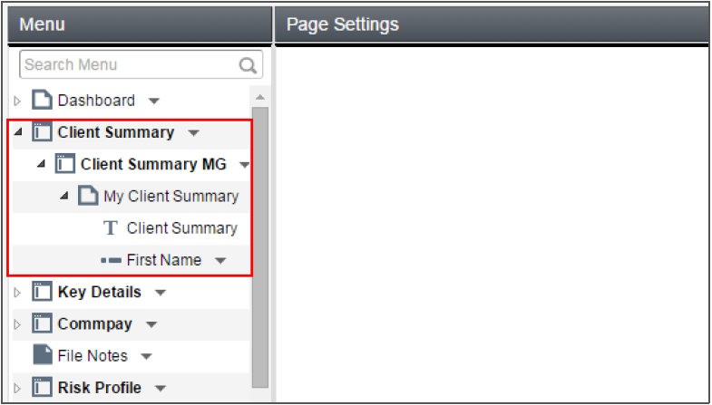 On the new ‘Client Summary’ menu you just created, we will add a new ‘Page’ element.