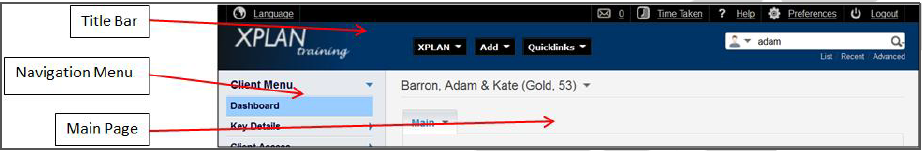 The XPLAN interface is composed of three areas, the Title bar, the Navigation menu, and the Main Page.