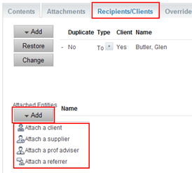 Once you have coded your email, go to the Recipients/Clients tab and click the Add button (as highlighted below), and attach a Client, Supplier, Professional Adviser or Referrer.