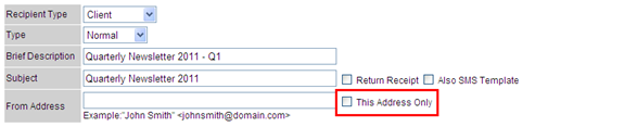 The From Address field can be used to set the default sender email address. Tick This Address Only to 'lock' the sender details, preventing users from changing the sender email address.