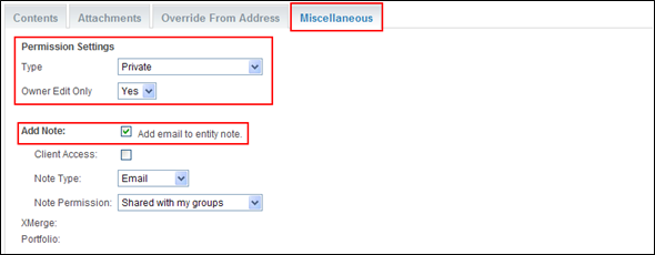 The Miscellaneous tab is used to set visibility permissions, and also ensure that a copy of the email sent to the client is stored as a file note against the client record.