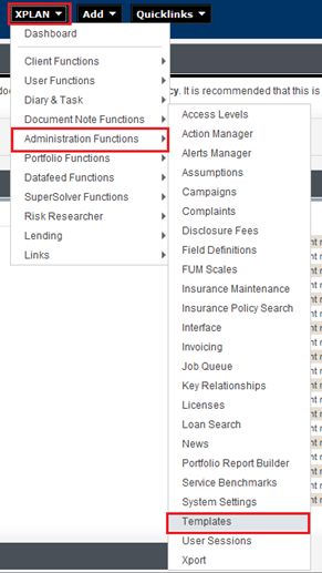 Access Template Management by clicking Xplan button, select Administration Functions > Templates