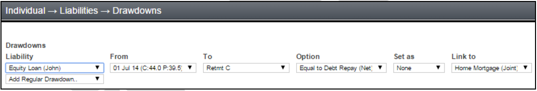 Enter the amounts to be invested into the Managed fund by using the ‘Equal to Debt Drawdown’ option, as per the screen below. Once you choose this option, you will need to select from which loan the amount will be funded. In this case, we can choose the Home Equity Loan. This option will draw the initial amount ($150,000) as well as the ongoing amounts repaid on the mortgage.