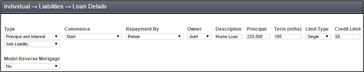 Ensure the information displayed on the Liabilities/Repayments screen appears as follows: