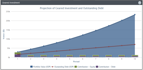 Towards the bottom of the screen, you can see the change in gearing ratio over the course of the projection period; this is because of the association between the Margin Loan and the Managed Fund portfolio.