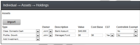Note: Be sure not to input a ‘Value’; as this will assume that the investment is already held as there is no option for a deferred start date. This will be done via the Assets > Transactions screen.
