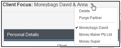 Client name - when a client has associated entities, such as a companies, trusts or SMSF, you can click the client's name and select an entity to access it.