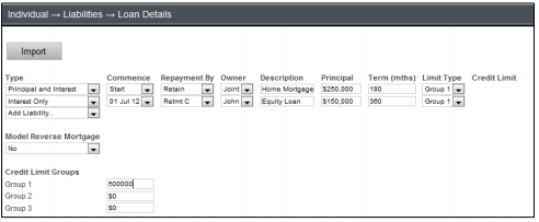Once you select ‘Group’ credit limits, a box will appear to enter the overall credit limit for thespecified group of assets (eg Group 1, Group 2, Group 3). In this case we will use $500,000 as the limit. The Credit Limits for all loans should be part of the same Group if they are using the same asset as equity. In this case, we will use Group 1 for both the existing Mortgage as well as the Home Equity Loan.